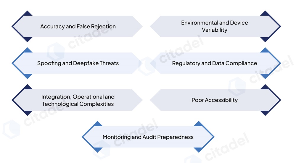 These challenges include accuracy and false rejection, environmental and device variability, spoofing and deepfake threats, regulatory and data compliance, integration and operational complexity, accessibility, monitoring, and audit preparedness.