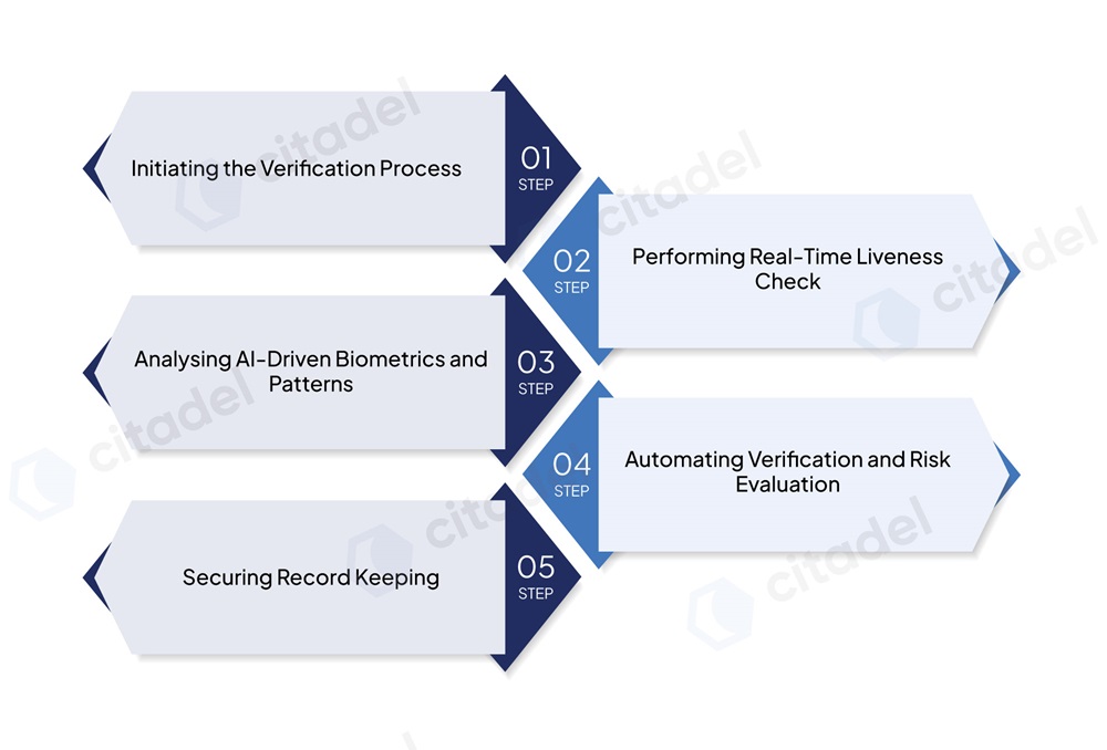 Liveness Check involves initiating the verification process, performing real-time liveness actions, using AI-driven biometric and pattern analysis, automating verification and risk evaluation, and securing the record-keeping process.
